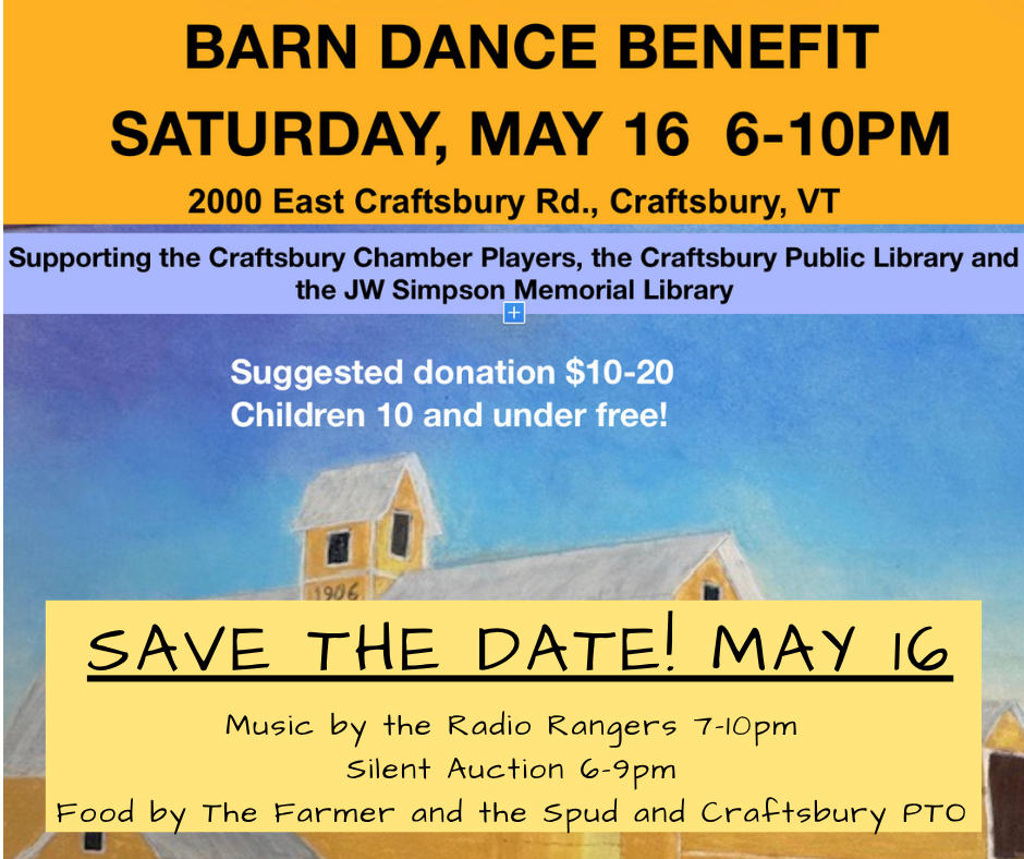 Mark your calendars! On Saturday, May 16, 6 to 10 pm Dave Rowell is hosting a benefit Barn Dance and Silent Auction at his Brassknocker Farm Barn in East Craftsbury. Fundsraised at the event will go to support three local non-profit organizations: the Craftsbury Chamber Players, the Craftsbury Public Library, and the John Woodruff Simpson Memorial Library.