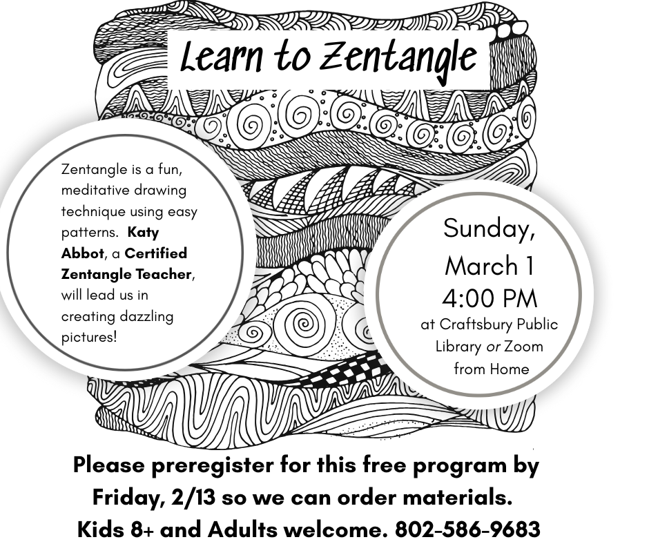 Zentangle is a fun, meditative drawing technique using easy patterns. Katy Abbot, a certified Zentangle teacher, will lead us in creating dazzling pictures! Ages 8+ welcome.